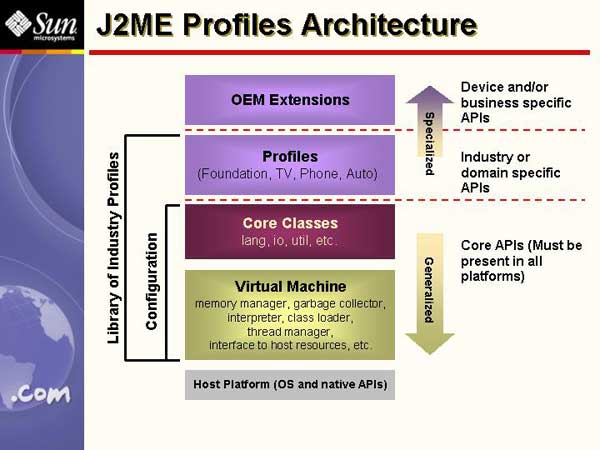 J2ME的架构是把我们传统的Java架构:硬件/OS/JVM/APIs/应用加一变化,变成了:硬件/OS/Configuration/Progile/应用。之所以采用这样的架构是由我们上面所谈到的J2ME的特殊性有关。